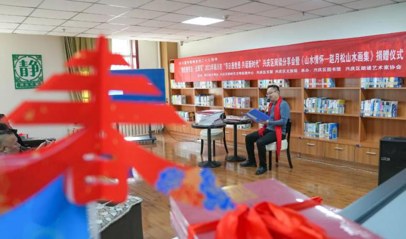 2月5日下午,由银川市文明办、兴庆区新时代文明实践中心、兴庆区文联、兴庆区文化旅游体育广电局主办,兴庆区图书馆、兴庆区朗诵艺术家协会承办的“节日感党恩 共话新时代”阅读分享会暨《山水情怀—赵月松山水画集》捐赠仪式,在兴庆区图书馆举行。