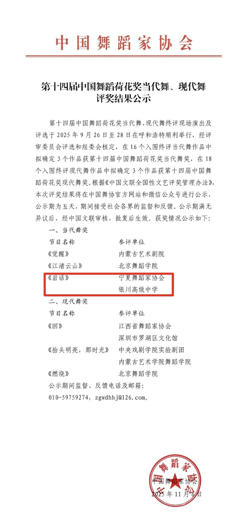 在自治区党委宣传部的大力支持指导下,由宁夏文联、宁夏舞协选送,银川高级中学创作表演的当代舞《岩话》凭借深厚的文化内涵与精湛的艺术表达脱颖而出,成为本届荷花奖当代舞类别的全国3部获奖作品之一,实现了宁夏在当代舞奖项上零的突破,为12年后再次获得荷花奖。并于11月参加由中国文联指导、中国舞协主办的“繁花竞放”2025中国舞蹈荷花奖精品巡演(长沙站)。