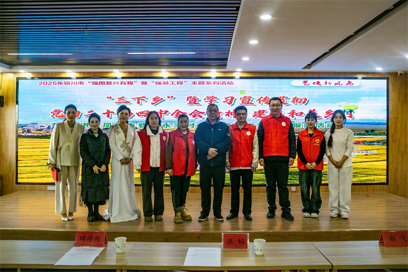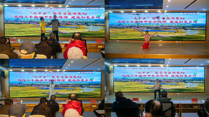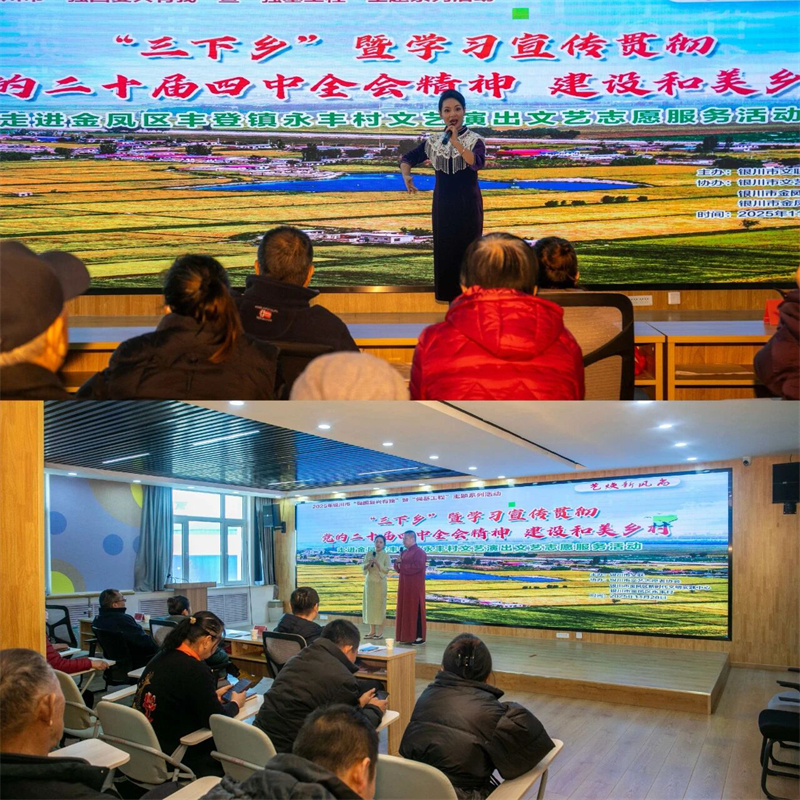 为深入学习宣传贯彻党的二十届四中全会精神,用文艺的生动形式赋美乡村,引导全会精神在群众中得到更深浸润,激励群众坚定信心,开拓创新,全力加强乡村产业振兴、生态环境治理、文旅融合发展、文化建设,共建和美乡村,2025年11月28日,由银川市文联主办,银川市文艺志愿者协会、银川市金凤区新时代文明实践中心、银川市金凤区永丰村承办的“三下乡”暨“学习宣传贯彻党的二十届四中全会精神 建设和美乡村”走进宁夏银川市金凤区丰登镇永丰村开展文艺演出暨文艺志愿服务活动。