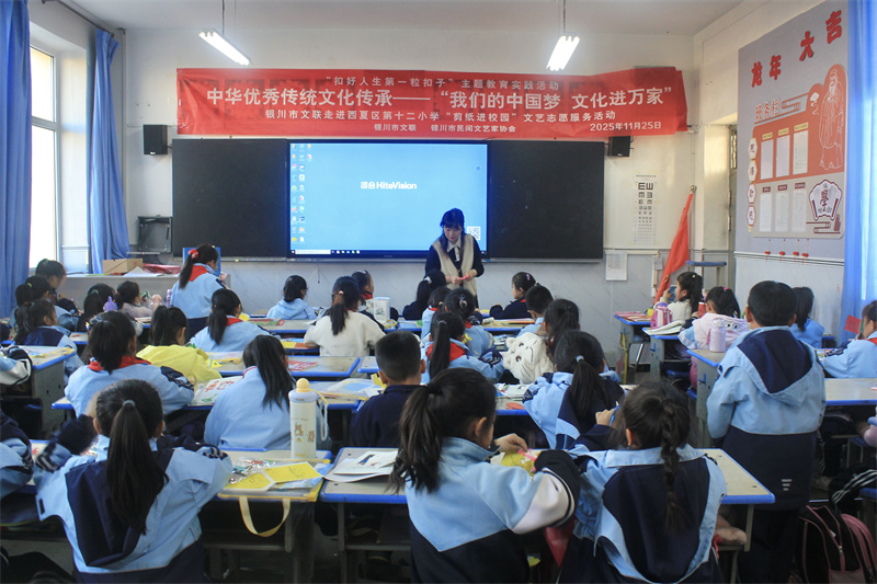 为深入学习宣传贯彻党的二十届四中全会精神,认真践行习近平文化思想,持续推动中华优秀传统文化更好地在青少年中得到巩固和传承,2025年11月25日下午,由银川市文联主办,银川市民协承办的“我们的中国梦 文化进万家——系好人生第一粒扣子 剪纸进校园”文艺志愿服务活动在银川市西夏区第十二小学顺利开展。