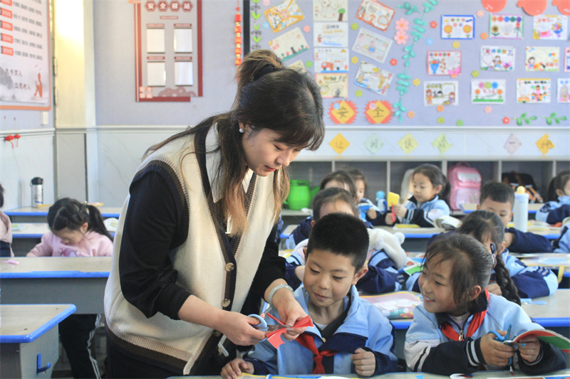学生们听得十分入神。为了让他们更好地感受剪纸艺术的魅力,两位艺术家还现场手把手地教孩子们剪纸。只见剪刀翻飞,红纸绽花,不一会儿,一个个生动的剪纸花朵、剪纸小动物像变魔术似地活灵活现地呈现出来。它们虽略显稚嫩,但也生动可爱,孩子都特别开心。
