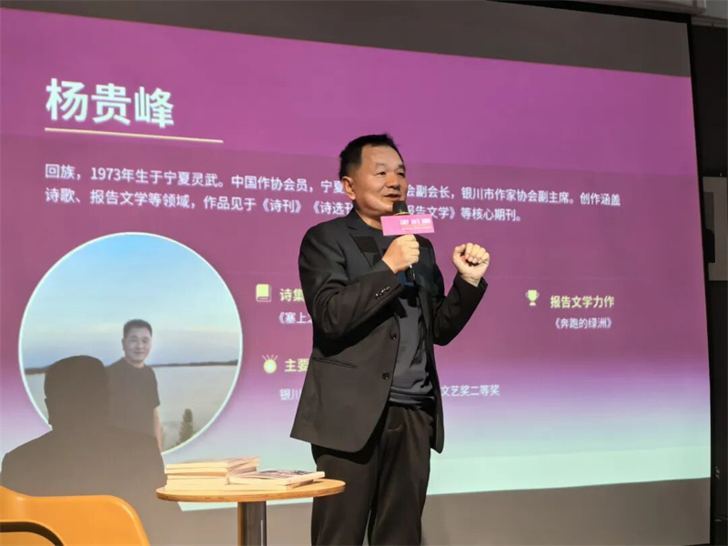 杨贵峰带着自己的诗集上台,分享里满是对这片土地的深情。他现场朗读《山路和远方》。《塞上之光》这本诗集,是他写给家乡的情书,也是一位本土作家,用文字为塞上大地记录的赤诚。