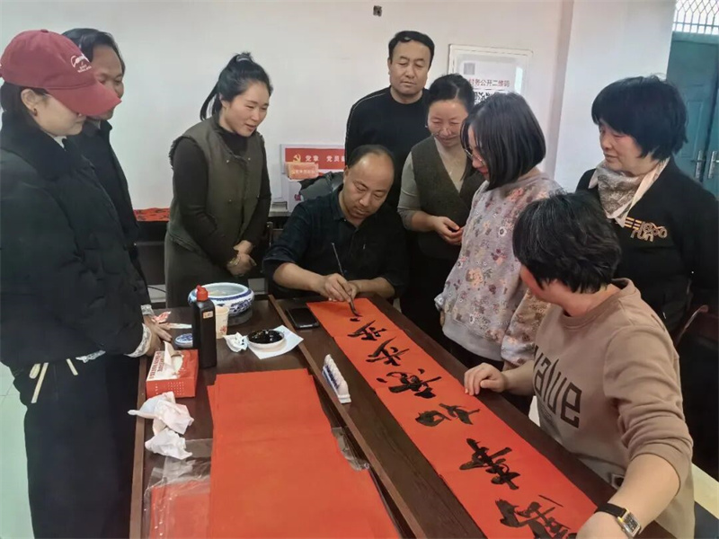 在各村(社区),书画老师们挥毫泼墨,将对新春的祝福倾注于笔尖。楷书端庄秀丽、行书流畅飘逸、隶书古朴典雅,一副副寓意吉祥的春联、一张张饱满深情的“福”字跃然纸上。“老师写的这个‘福’字真精神!往年都是买印刷的,今年有老师手写的,感觉福气更足、年味更浓了!”居民张阿姨高兴地说。在近3个小时的创作中,书画老师们共送出春联和福字数百副,火红的春联如同温暖的纽带,将新春的暖意传遍了镇北堡镇的街巷院落。