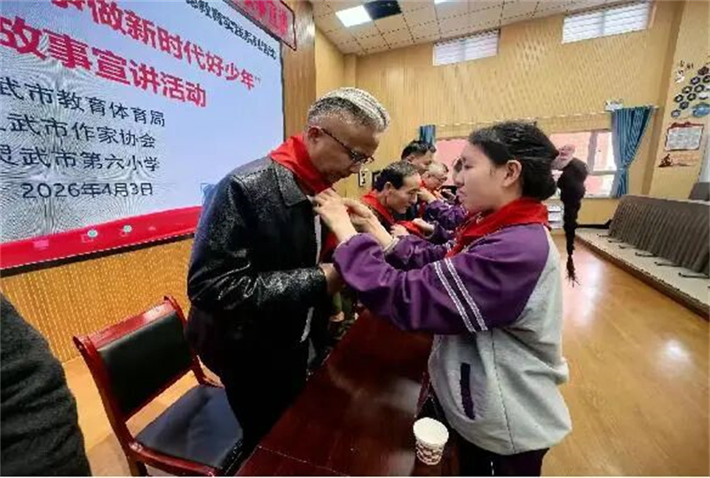 随后,在灵武市第六小学阶梯教室,蔡国为师生们进行了一场“赓续红色血脉 争做新时代少年”红色故事主题讲座。这是一堂生动的爱国主义教育课,更是一次深刻的精神洗礼。活动在雄壮激昂的《义勇军进行曲》中拉开帷幕,全体师生肃立并高唱国歌,饱含对祖国的赤诚与对先烈的缅怀。少先队员代表为越战老兵敬献红领巾,鲜红领巾系于胸前,象征少年先锋队对革命前辈的崇高敬意,是红色血脉的薪火相传,更是新时代少年与英雄跨越时空的精神接力。