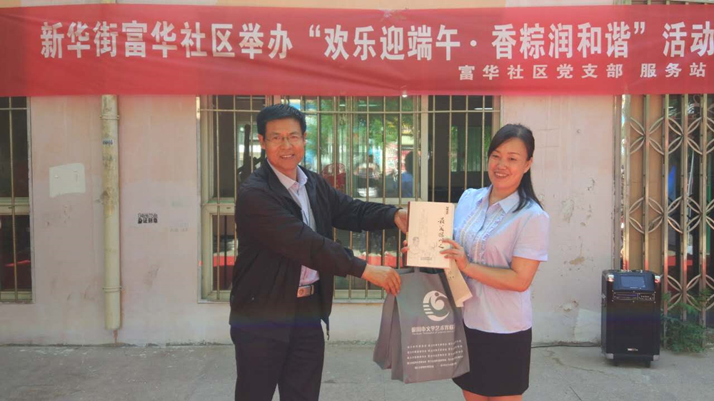 上午九点,市文联党员干部、社区居民志愿者一起来到活动现场,活动以热火朝天的社区居民包粽子大赛拉开帷幕。活动中,市文联党组成员、副主席杨红选向社区居民致以节日的祝福和问候,并向社区赠送了《最美银川人》《家训家书故事选编》《黄河文学》《银川文艺界》图书杂志和银川书画院专职书画家许金平创作的书法作品。社区志愿者们为大家表演了自编自导的民族舞、合唱、交谊舞、太极扇等节目。