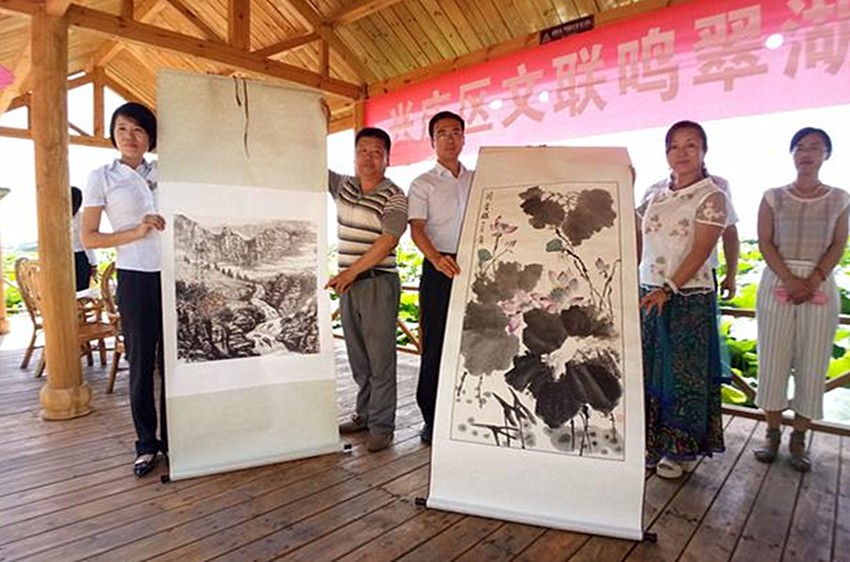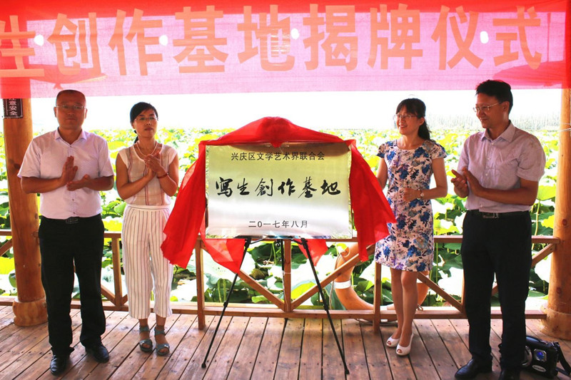 8月10日,兴庆区文联写生创作基地揭牌仪式在鸣翠湖国家湿地公园举行。银川市文联党组书记张秉东、市文联副主席杨红选、兴庆区政府副区长马咏晖、文体旅游局副局长惠平等相关领导及著名书画家马建军、赵忠、郭佳荣等出席了揭牌仪式。兴庆区文联为鸣翠湖赠送了书画作品,并进行现场笔会。