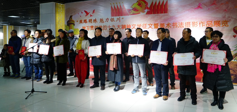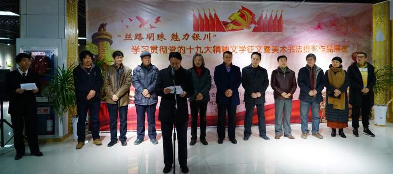 12月26日上午,由银川市文联主办,银川市作协、美协、书协、摄协承办的“丝路明珠·魅力银川”学习贯彻党的十九大精神文学征文暨美术书法摄影作品展览在银川文化艺术中心隆重开幕。中共银川市委宣传部副部长胡志平,自治区摄影家协会主席张春荣,市文联党组书记张秉东,市文联主席郭文斌,市文联副主席赵杰及市美协主席何立宏等七位协会主席、副主席参加。