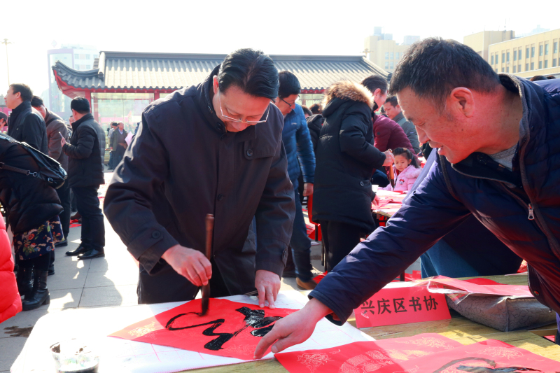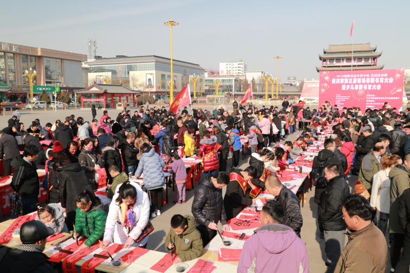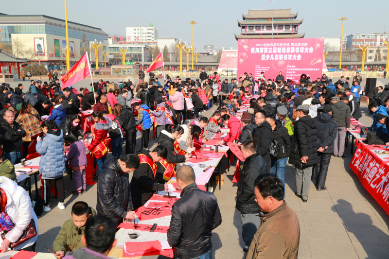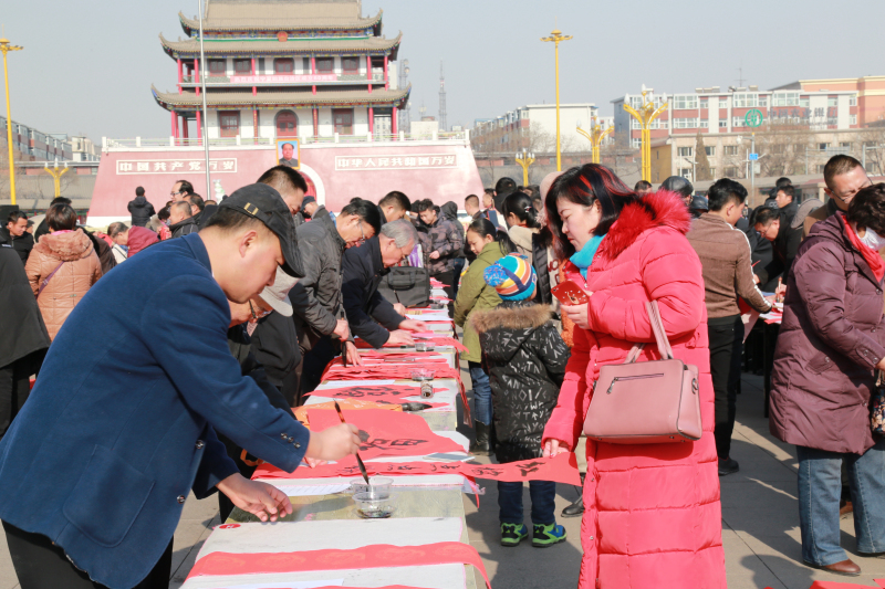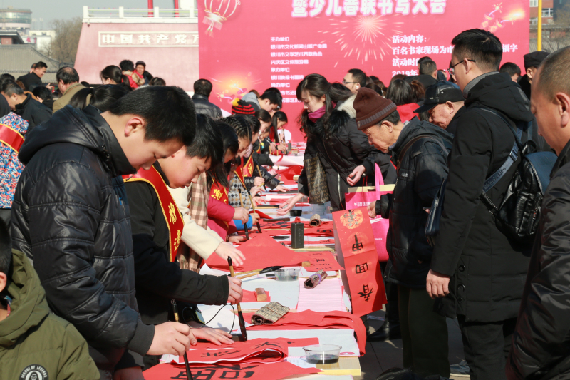 2019年1月26日下午,由银川市文化新闻出版广电局、银川市文联、兴庆区文体旅游局、银川市书协、宁夏书画艺术发展促进会、银川晚报书画院共同举办,红玛瑙枸杞观光园赞助的“银川市第三届现场春联书写大会暨少儿春联书写大会”在银川南门广场举行。200余名书法家及书法爱好者现场书写春联及“福”字,向市民们送出了2019年新春的祝福。
