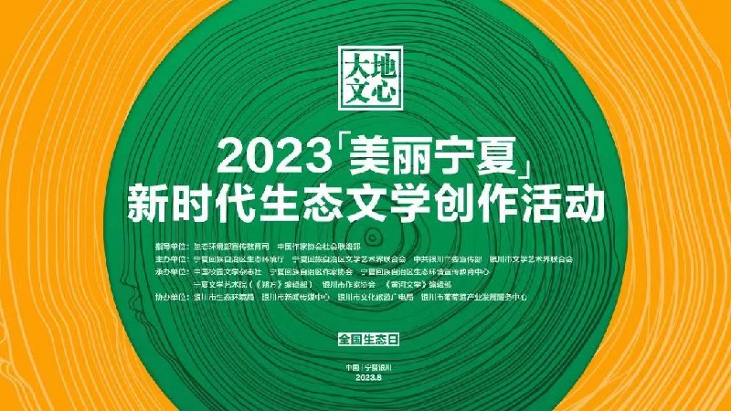 为深入贯彻习近平生态文明思想,聚焦新时代生态文明建设和生态环境保护伟大实践,繁荣生态文学,弘扬生态文化,推动《关于促进新时代生态文学繁荣发展的指导意见》落地见效,讲好宁夏生态环保故事,由生态环境部宣传教育司、中国作家协会社会联络部指导,宁夏回族自治区生态环境厅、宁夏回族自治区文学艺术界联合会、中共银川市委宣传部、银川市文学艺术界联合会主办,中国校园文学杂志社、宁夏回族自治区作家协会、宁夏回族自治区生态环境宣传教育中心等单位承办,在8月15日首个“全国生态日”到来之际,举办2023“美丽宁夏”新时