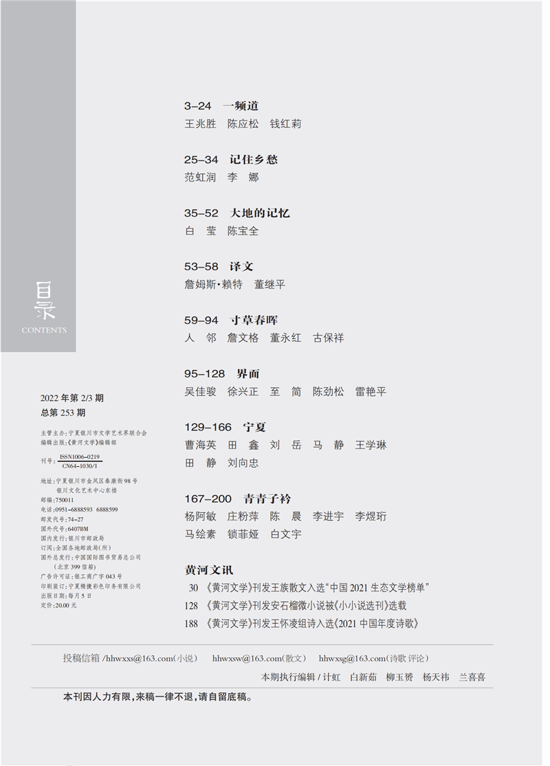 《黄河文学》2022年2/3期合刊期目录