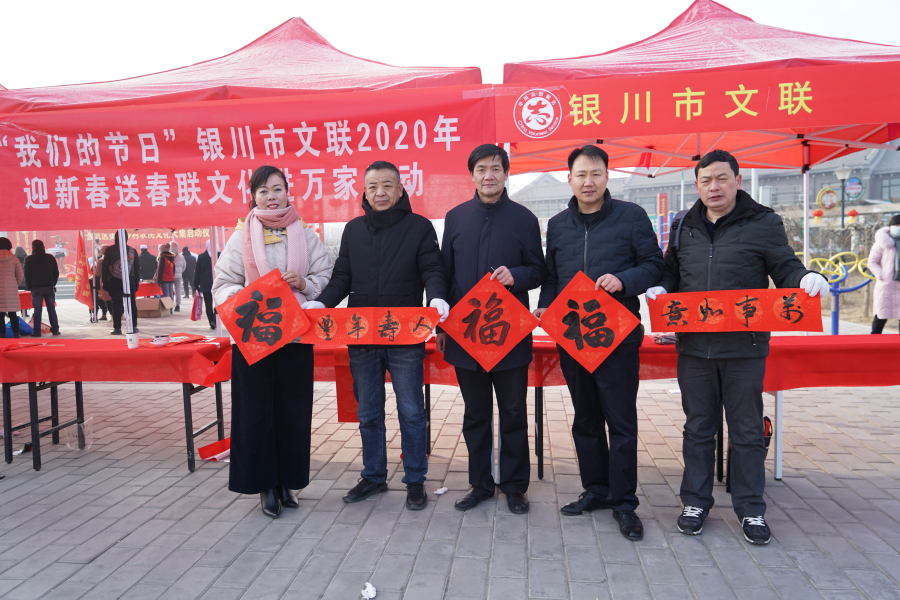 银川市文联为积极响应“三下乡”活动,组建了“我们的节日”银川市文联2020年迎新春送春联文化进万家志愿服务小分队。当天上午,文艺小分队为金凤区良田镇农民送去了《黄河文学》《银川文艺界》《家风家训故事选编》等期刊、图书1200余册,书写春联800余幅,受到当地群众的欢迎和喜爱。
