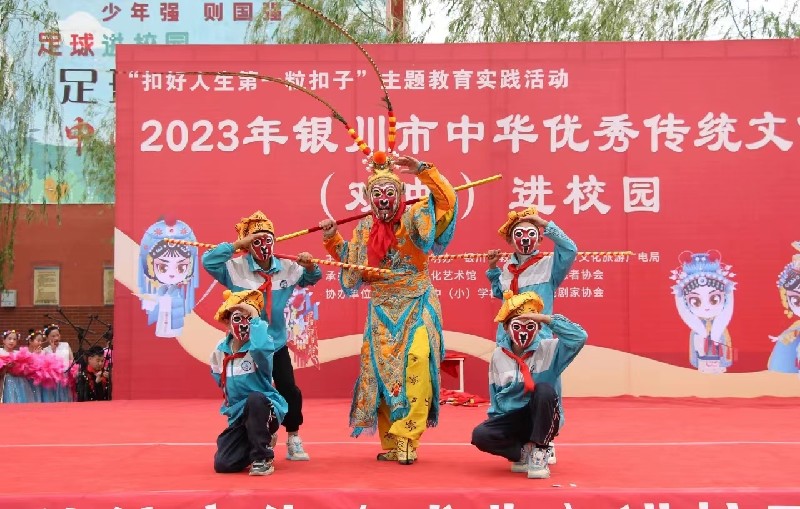 花儿、魔术、戏曲、相声、杂技等精彩节目应接不暇,永宁县闽宁镇武河小学的同学们也带来了合唱与舞蹈节目,为整场活动增色不少,精彩的演出赢得了大家阵阵掌声和呐喊,把现场气氛多次推向高潮。其中,最受欢迎的当属戏曲表演《功夫美猴王》,伴随着激昂明快的音乐,“美猴王”挥舞金箍棒,再现英姿,金箍棒灵活快速地旋转,美猴王的浩然正气和机智勇猛展现得淋漓尽致。戏曲老师还邀请了台下学生登台互动,模仿孙悟空的经典动作,指点猴戏功夫,大家学得有模有样,活脱脱成了“小猴子”,台上台下的同学们都乐在其间,学在其中,充分领略了戏曲表演的艺术魅力,加深了对优秀传统文化的认识和理解。