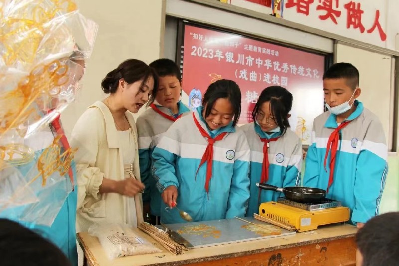 米雕、泥塑、编结、剪纸、葫芦烙刻画、贺兰石篆刻等共十项非遗技艺在校内集中展示,同学们把每个展区围得“水泄不通”,大家争先恐后的体验着各色项目,在老师的讲解与同学们的亲手体验中,潜移默化的将非遗文化得以薪火相传。花儿、相声、皮影、糖画老师走进课堂,为学生展示、教授,帮助孩子们拓宽视野,提升美育素养,引导孩子欣赏非遗、爱上非遗,树立起保护非遗、传承非遗的意识。