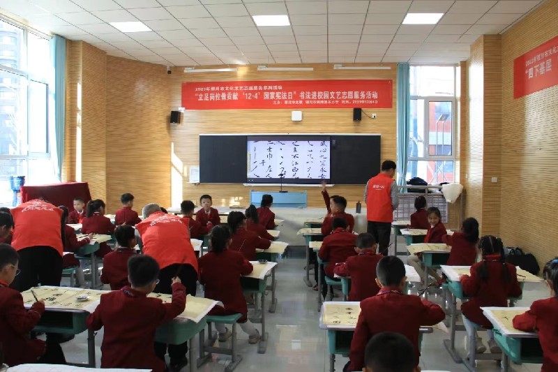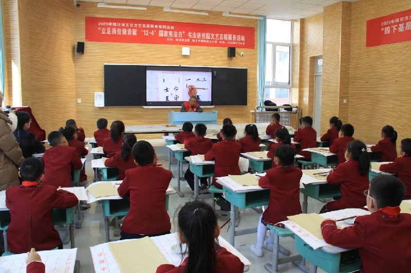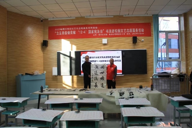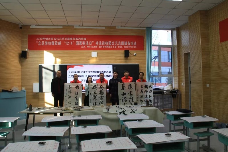 2023年12月4日下午,正值一年一度的“国家宪法日”和第六个“宪法宣传周”期间,银川市文联组织范彦奎、袁静坤、王彦骏、马越四位书法家走进银川市阅海第五小学开展了“立足岗位作贡献 ‘12·4’国家宪法日”书法进校园文艺志愿服务活动。