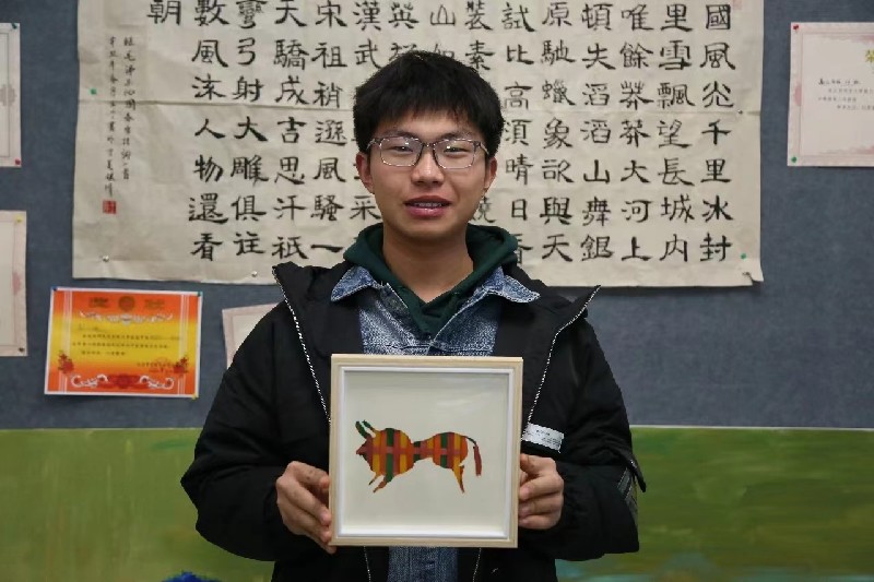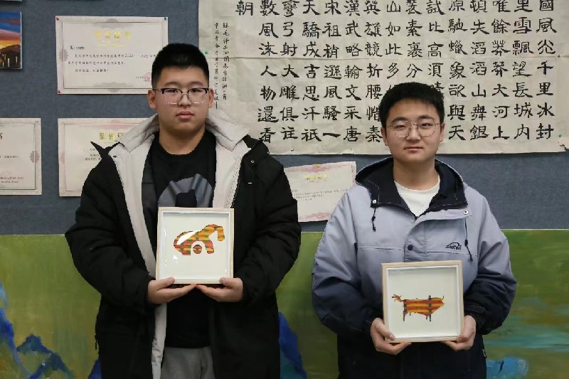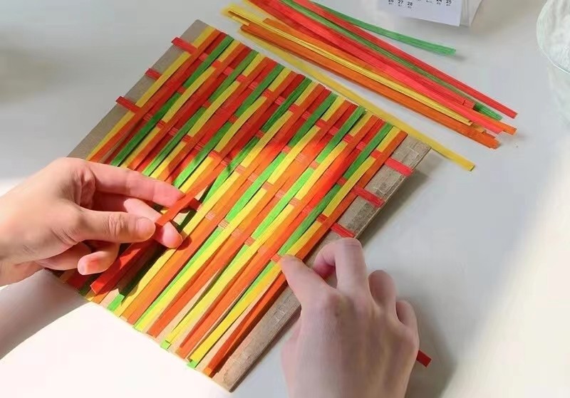 近两个小时的课程内,在文艺志愿者们的示范教学下,同学们先选取岩画图案,并用复写纸拓印在卡纸上,用刻刀刻出图案,再将彩色竹编条编织成合适大小,经过大家不断地讨论、摸索、改进,一件件由同学们亲手制作的虽稚拙却萌动的竹编岩画作品呈现在大家眼前。同学们成就感满满,对竹编岩画爱的种子也悄悄种在了他们心里。