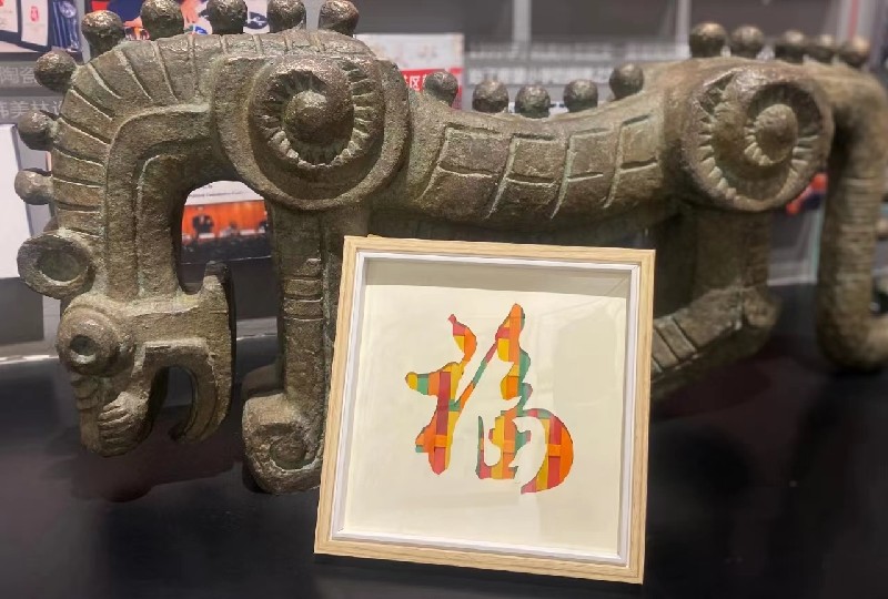 ▲以韩美林书写的“福”字为原型制作的竹编画作品