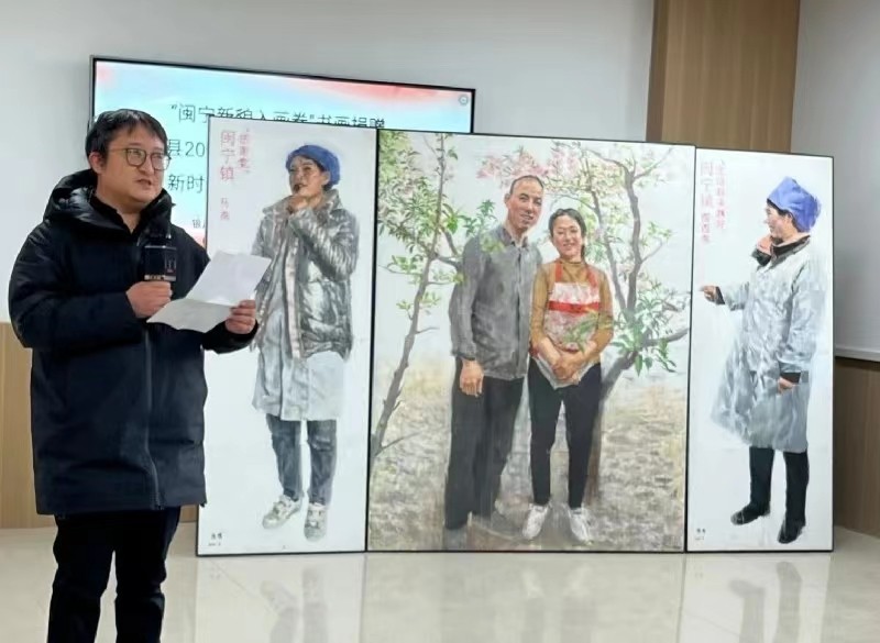 活动现场,宁夏大学美术学院副教授陈博向闽宁镇新时代实践所捐赠美术作品《闽宁镇》三幅,三幅画作分别展示了闽宁镇创业、致富带头人马权夫妇、马燕、摆西彦的形象。“马燕熟练地为访客讲解电商扶贫车间和巧媳妇们的故事,摆西彦是车间和直播间里最活跃的一抹身影,而进入马权夫妇温暖的小院里,桃花盛开,宾客络绎不绝,夫妻俩由心而发的笑容令人印象深刻,这笑容是对大门匾额上题写的‘好日子是奋斗出来的’最好注解。”回忆起创作灵感时,陈博充满感慨。