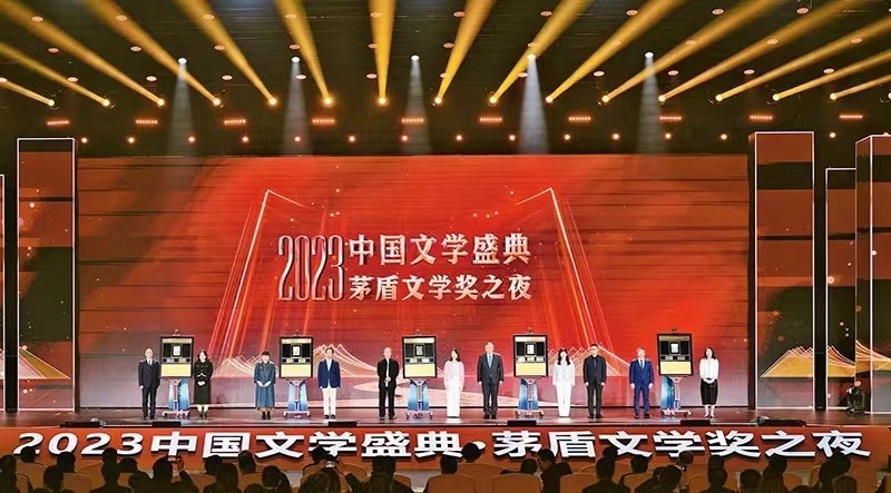 2023年11月19日晚,由中国作家协会、浙江省人民政府主办的“2023中国文学盛典·茅盾文学奖之夜”在浙江省桐乡市乌镇互联网国际会展中心隆重举行。图为5位获奖作家与获奖作品编辑共同上台,在镌刻有获奖书名、获奖作者、编辑姓名的书型装置上留下金色手印。中国作协供图