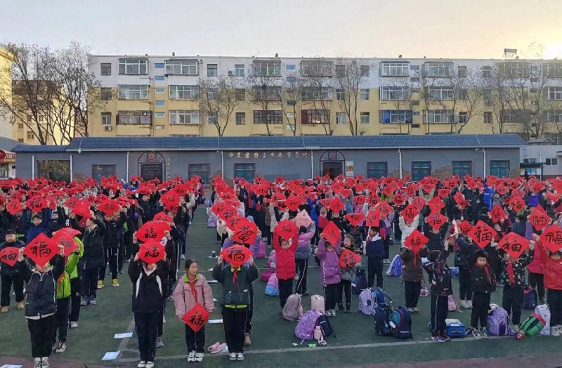 2023年12 月29日下午,兴庆区景岳小学近千名师生手举福字迎接新年,“辞旧迎新,福影随行”的呼声响彻校园。