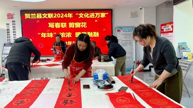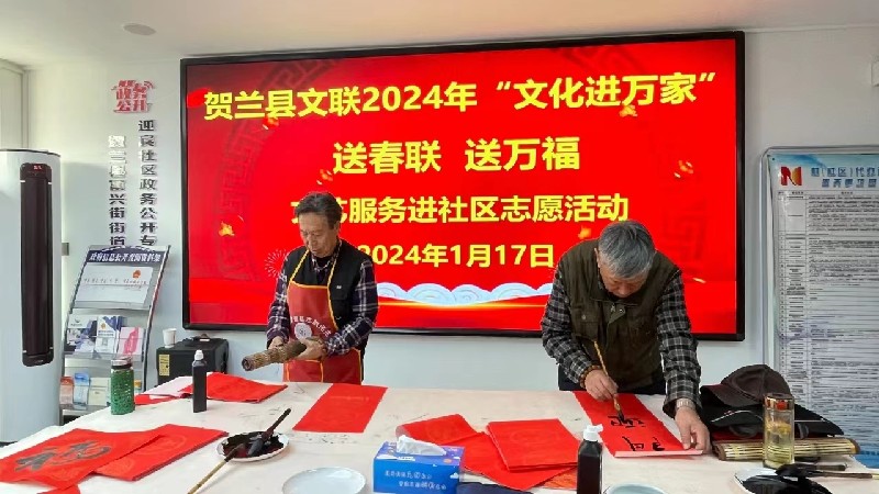 笔墨迎新春,春联送福至。为进一步巩固“强基工程”,助力基层精神文明建设,更好地传承中华优秀传统文化,营造喜庆祥和的文化氛围,在2024年春节来临之际,贺兰县文联组织贺兰县书法家协会、贺兰县老年书画协会的书法家们走进贺兰县迎宾社区开展“文化进万家”送春联送万福文艺志愿服务活动。