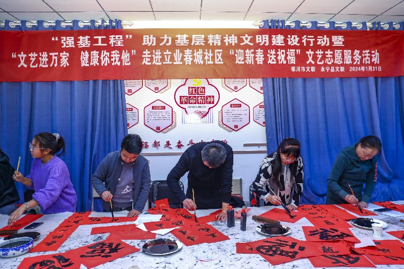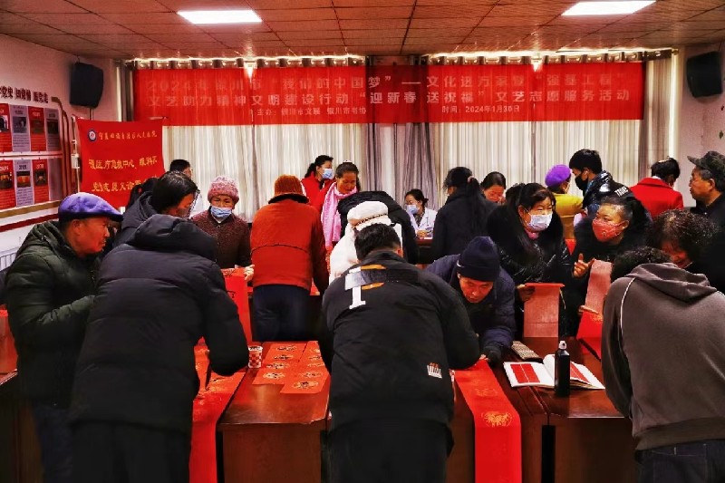 为深入落实中国文联“强基工程”、“我们的中国梦——文艺进万家”、“文艺进万家 健康你我他”等文艺志愿服务倡议,在2024年龙年春节来临前夕,银川市文联组织文艺家深入乡村、社区开展送春联、福字,送文艺节目等文艺志愿服务活动,提前为群众送去龙年新春的诚挚祝福,为他们的节日生活增添了喜庆的氛围和多姿色彩。