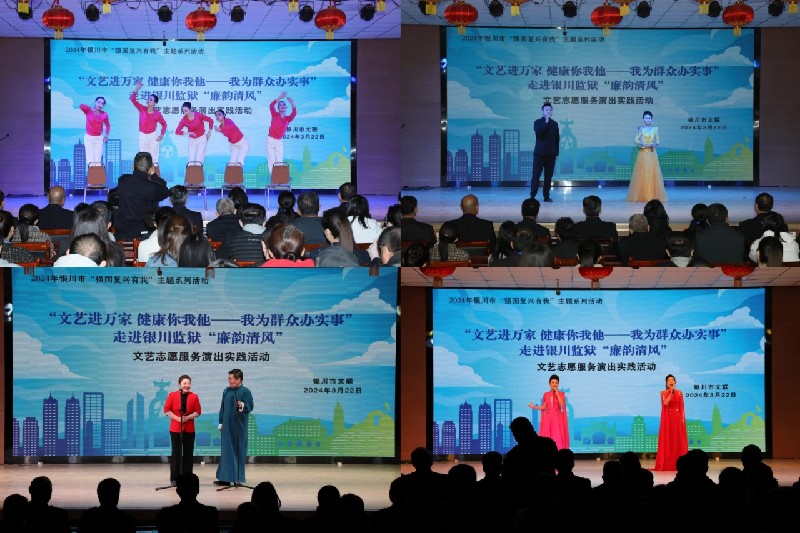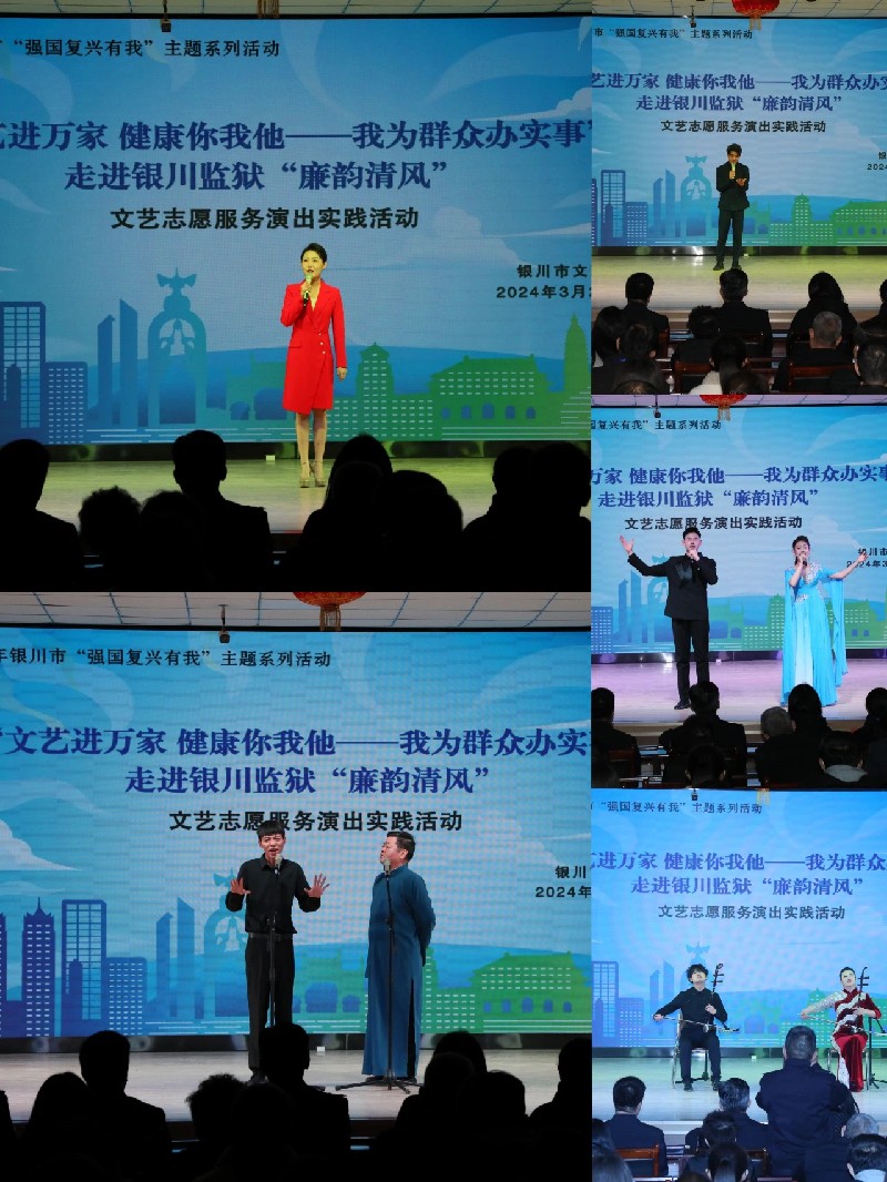 为进一步增强此次廉政警示教育活动感染力与成效,按中国文联“文艺进万家 健康你我他”文艺志愿服务项目要求,银川市文联十分注重将文艺宣传的触角伸向更广泛的基层一线、人民大众,用文艺的力量弘扬真善美,鞭挞假恶丑,温润心灵,培根铸魂,因此此次活动,银川市文联特组织银川艺术剧院、银川市朗诵艺术家协会的文艺工作者,以“学党纪法规 守纪律底线”这一主题,为现场党员、人民警察送上了一台“文艺进万家 健康你我他——我为群众办实事”“廉韵清风”文艺志愿服务演出。