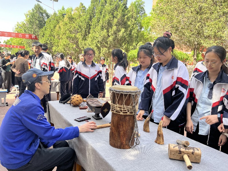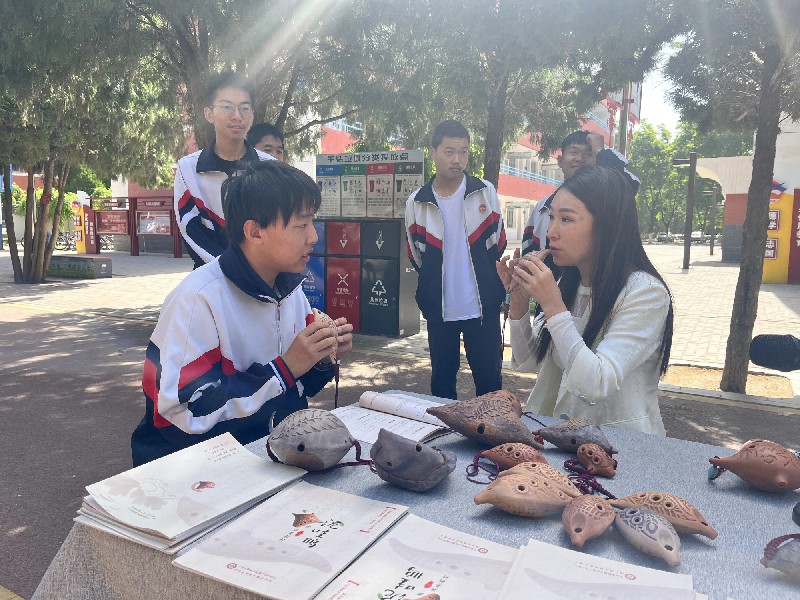 在泥哇呜的展台前,传承人王娟演奏一曲熟悉的《神话》主题曲时,悠扬的旋律瞬间萦绕在整个校园。每一个音符都如同跳跃的精灵,在空气中舞动。独特的音色仿佛带着学生们穿越时空,进入古老而又充满奇幻色彩的音乐世界。学生们沉浸其中,被这美妙的音乐深深吸引,一曲终了,现场响起了学生们热烈而持久的掌声。这掌声,不仅是对演奏者精彩技艺的赞赏,更是对传统文化魅力的由衷感叹和喜爱。让学生们深刻感受到了非遗与现代音乐碰撞所产生的奇妙火花,也进一步激发了他们对非物质文化遗产传承的热情与使命感。