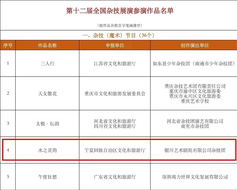 第十二届全国杂技展演,全国共有36个杂技(魔术)作品、8部杂技剧入选,《水之灵韵》的入选充分展示了银川市杂技艺术的不俗实力。该节目是三人倒立杂技,以水的灵动与包容为主题,巧妙地用人体动作变幻,表现了水或平静,或奔腾的各种形态,音乐与演员动作的完美融合,给观众带来了强烈的艺术震撼。