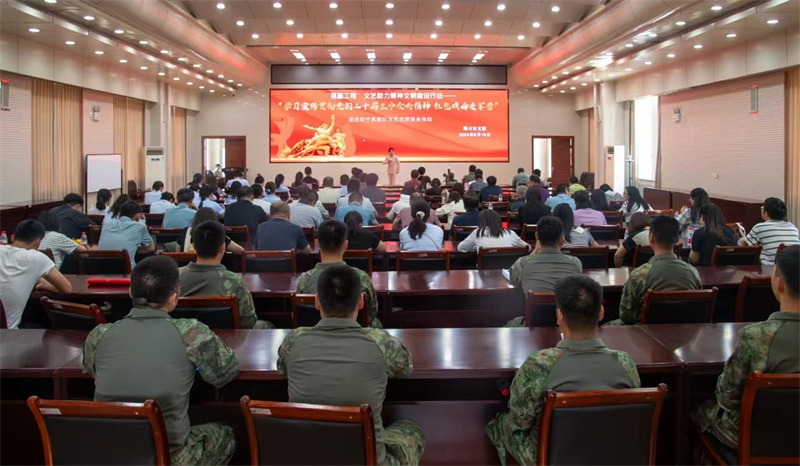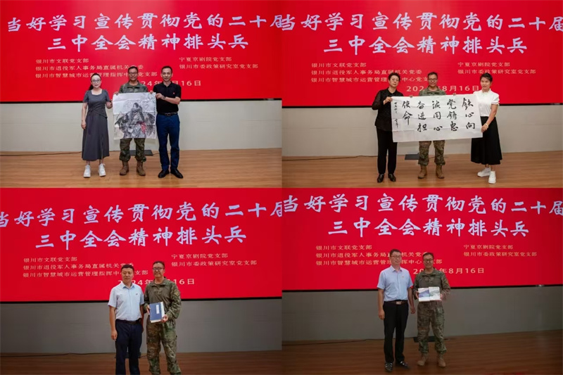 为深入学习贯彻党的二十届三中全会精神、习近平总书记考察宁夏重要讲话精神、习近平总书记关于双拥工作重要论述精神,引导广大党员干部不忘初心、牢记使命,开拓进取、攻坚克难,争当学习宣传贯彻党的二十届三中全会精神排头兵,推动党建工作高质量发展,按照银川市直机关工委开展八月份“支部主题党日”活动的要求,2024年8月16日,银川市文联党支部、宁夏京剧院党支部、银川市退役军人事务局直属机关党委、银川市委政策研究室党支部、银川市智慧城市运营管理指挥中心党支部共同走进驻宁某部队开展了“当好学习宣传贯彻党的二十届三中全会精神排头兵”主题党日活动。