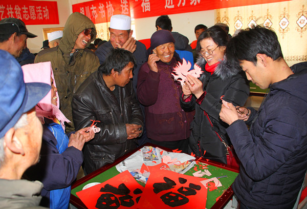 1月19日,银川市文联、银川市行政审批局走进共同的结对扶贫村——兴庆区月牙湖乡滨河四村,对该村村民开展了春节前的扶贫慰问活动。银川市文联党组书记张秉东带领干部职工和艺术家走访慰问村民,向他们致以新春的问候和祝福,同时组织书法家、摄影家、剪纸艺术家开展送春联、送照片及送窗花等文艺志愿服务活动,受到村民的热烈欢迎。