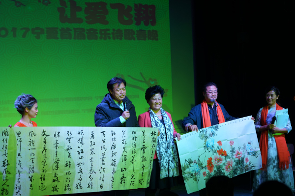 当天的活动现场,还举行了由宁夏作家协会联袂银川市作家协会、银川市诗歌学会、宁夏若愚影视传媒公司联合出品的宁夏首部公益纪录片《求学》首映式,这部纪录片记录了宁夏吴忠市红寺堡山区红沙窝支教点一个老师和五个孩子在大山深处生存、求学的真实场景,这也是宁夏第一部由宁夏作家自筹资金、在互联网进行众筹、策划出品和导演、摄制的纪录片。石嘴山市文联主席、著名书法家王奋勤,石嘴山市文联副主席、著名书画家丁淑萍还 向本次活动支持单位宁夏爱飞翔集团赠送书画作品。