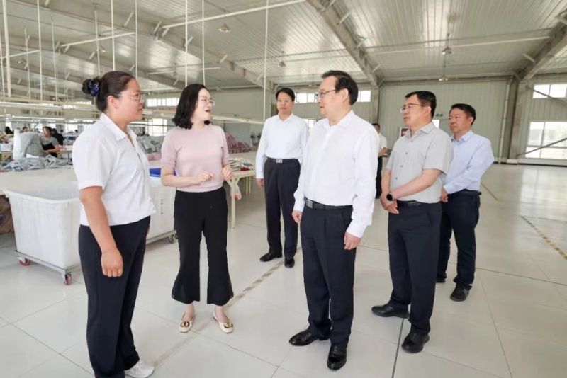 5月21日,梁言顺在灵武市城区街道镇河塔社区石榴籽就业车间,与企业员工交流。