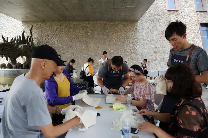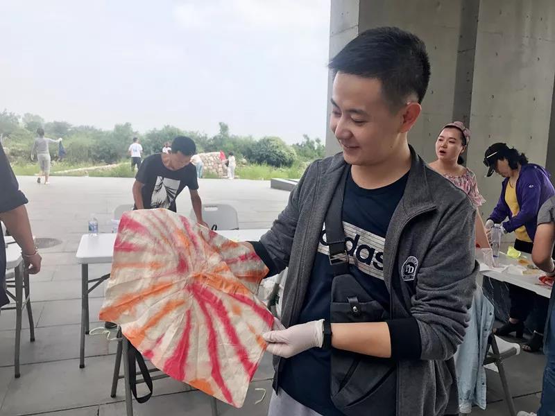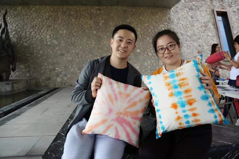 扎染抱枕的独特之处就在于不断的创新,没有重复,即使同一款布料,同一种颜色,同样的捆扎,最后染出来的也是不一样的色彩与图案,是机械印染难以达到的效果。现场色彩斑斓,大家用不同的色彩、不同的制作方式表达了对传统七夕的热情。
