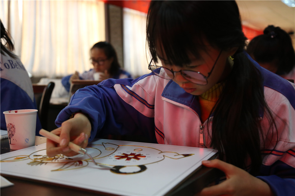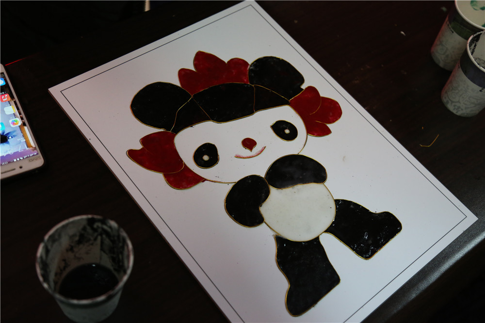 掐丝、调砂、上彩、固色……经过大家的协作和努力,一块块普通的白色底板,在一群“小艺术家”的手里变得与众不同,一幅幅色彩丰富的景泰蓝掐丝画跃然眼前。