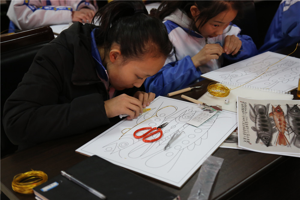 今天的实践课我们选取了2019年《己亥年》邮票设计原稿水墨画,同时选取了家喻户晓的“福娃”以及韩美林的“蛇”、“水墨鱼”等,用掐丝画的形式生动再现。