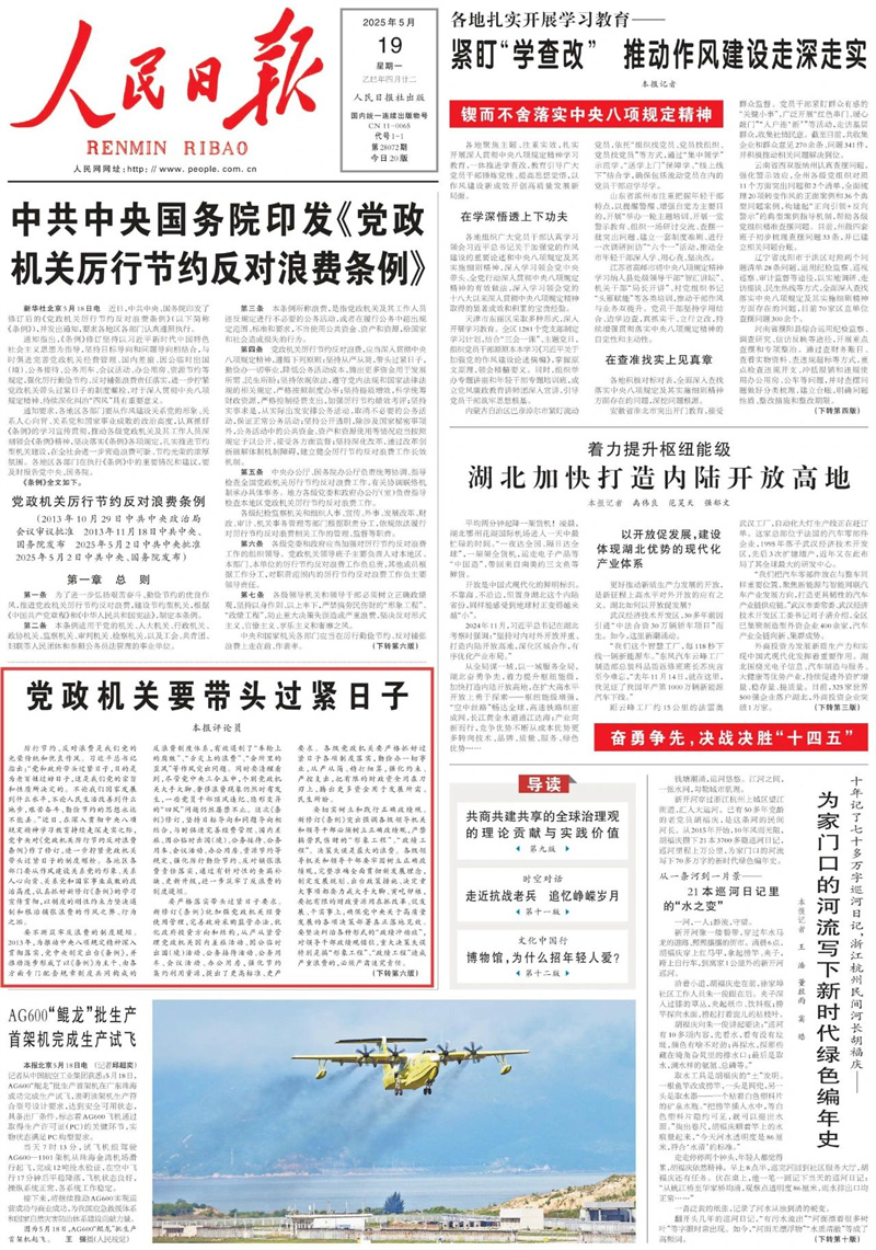 2025年5月19日出版的人民日报头版刊发评论员文章,题目为《党政机关要带头过紧日子》。全文如下: