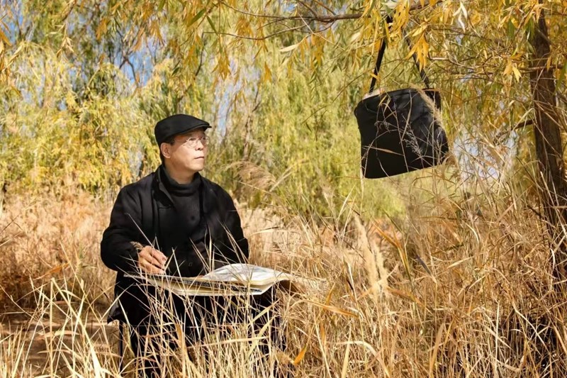 秋天的黄河岸边,天空高远,候鸟南飞,水面明澄,黄绿的树叶,萧萧的芦苇,优美的秋景,加上掌政镇乡村振兴的蓬勃城镇面貌,让画家创作兴致盎然,就地在河岸边支起画架,开始了现场采风创作。