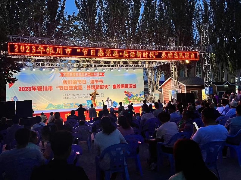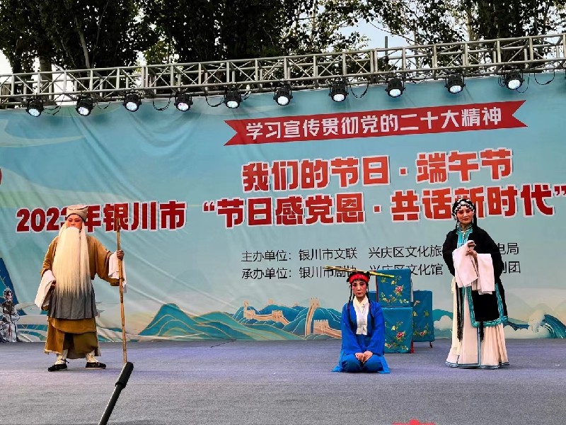 在2023年端午节即将之临之际,为认真学习贯彻习近平总书记在文化传承发展座谈会上的讲话精神,持续深化“我们的节日”系列活动,奋力打造中华传统文化创新性发展、创造性转化的银川样板,由银川市文联、兴庆区文化体育旅游广电局主办,银川市戏剧家协会、兴庆区文化馆、银新月剧团承办的“我们的节日·端午节”2023年银川市“节日感党恩 共话新时代”戏曲演出活动在兴庆区丽景湖新时代文明实践广场精彩上演。