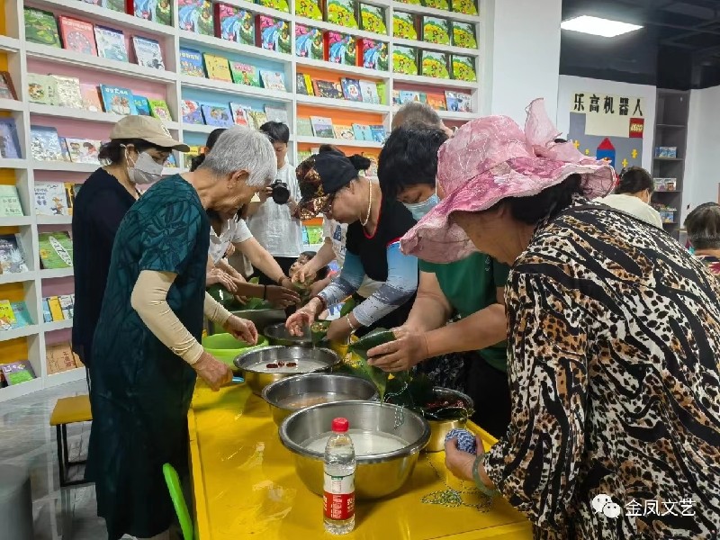“明端午”由金凤区作家协会的作家讲述端午节的来源、传说故事,让大家了解端午节蕴含的相关知识;“诵端午”文艺演出由金凤区音乐家协会、舞蹈家协会、戏剧家协会的艺术家们表演独唱、民乐演奏、戏曲唱段,如独唱《雨霖铃.秋别》、琵琶独奏《醉香》 、舞蹈《水墨丹青》等, 一个个富有中华优秀传统文化艺术魅力的精彩节目让大家深深地感受到了端午节的风情万种;“写端午”由书法家协会的书法家现场书写端午主题的书法作品,用书法的形式去亲近端午;“织端午”,民间文艺家现场教学编制五色线,并配戴在人们的手腕、脚腕上,传达出祈福纳吉的美好寓意;“品端午”,大家做漏斗、填糯米、加馅料、包裹、捆绑,井然有序地包粽子,当一片片清香的粽叶、一粒粒晶莹的糯米,在一双双巧手下转眼变成一个个诱人的粽子,空气中弥漫着粽叶香,气氛融融,欢声笑语不断,现场一位阿姨说“今天第一次跟大家一起学包粽子,感觉很有参与感、成就感,很开心!