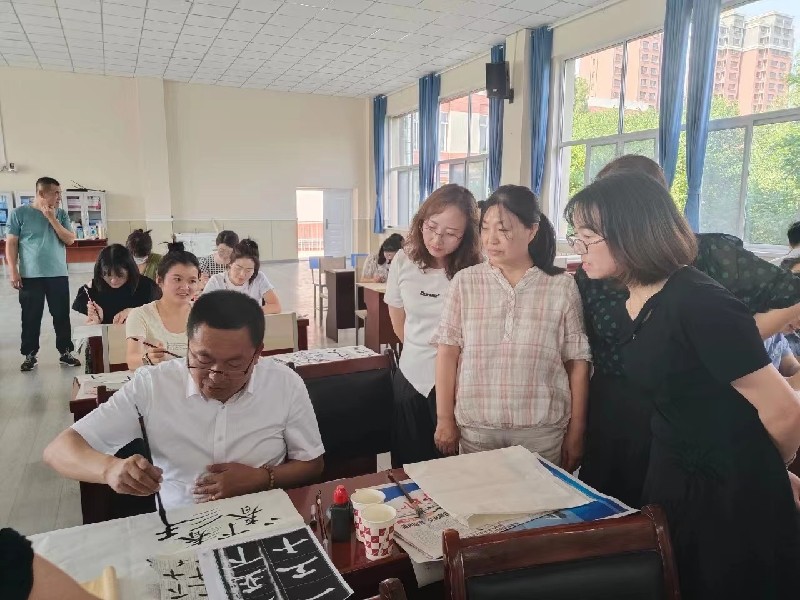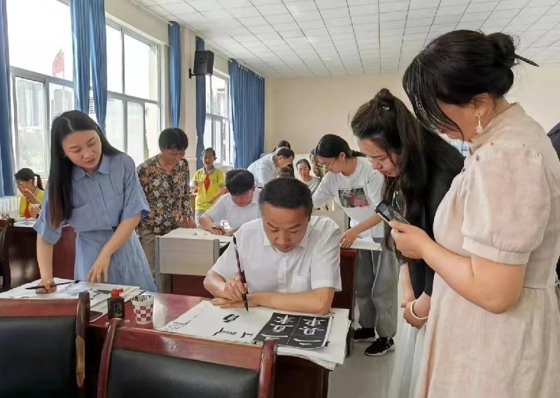与此同时,主席团其余老师分组对每位老师和同学进行现场辅导,手把手指导,面对面交流,一横一竖都是智慧,一起一伏皆是学问,在书写示范的过程中,逐一解答了师生们提出的问题。通过近一个半小时的深入交流,进一步提高了老师和同学的思想认识和书写水平。
