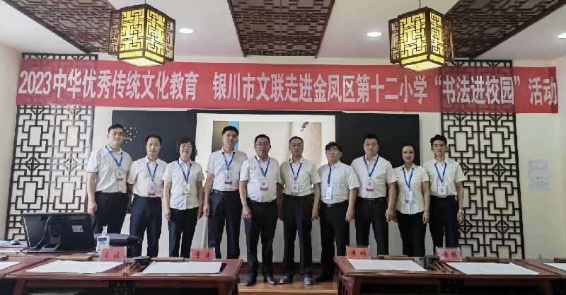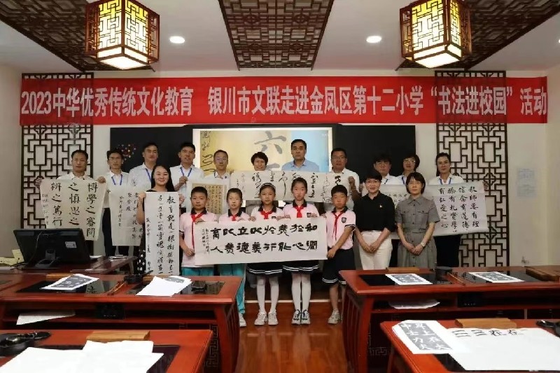 6月5日,银川市文联组织书法家走进金凤区第十二小学开展“书法进校园”活动,参加活动的有金凤区文联主席李彬,副主席王媛,金凤区第十二小学校长费涛,金凤区书法家协会主席黄镇,金凤区书法家协会主席团所有成员,以及金凤区第十二小学师生近80余人。