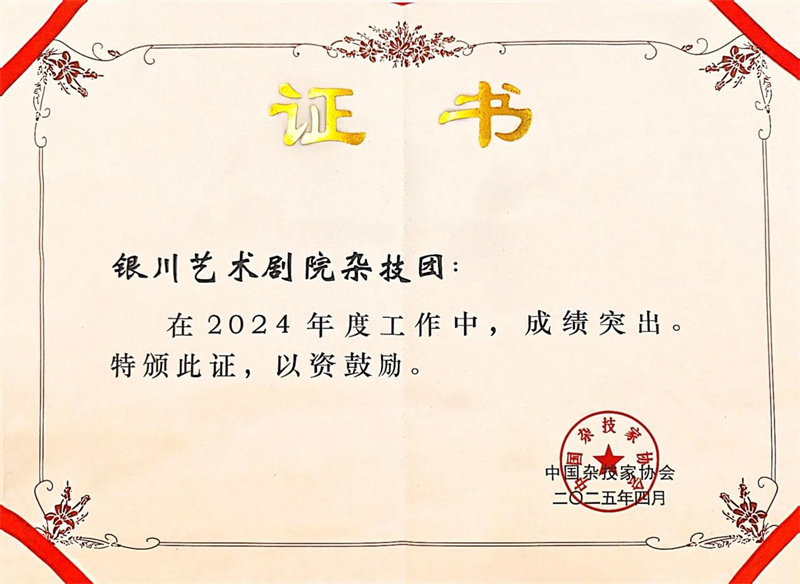 银川艺术剧院杂技团因工作业绩突出荣获“先进工作单位”荣誉称号。喜人的成绩,旨在表彰银川艺术剧院在杂技艺术工作中作出的重要贡献,体现了该院杂技团蓬勃发展的良好势头,更是中国杂协对银川杂技事业的充分肯定。