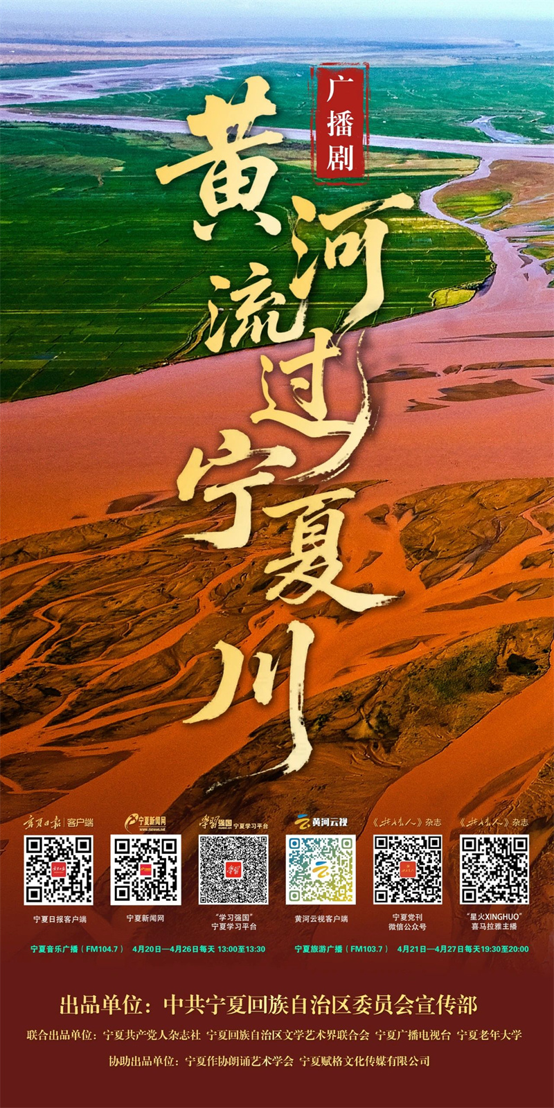 一条大河的深情,一方热土的心跳,尽在《黄河流过宁夏川》系列广播剧!由中共宁夏回族自治区委员会宣传部出品,宁夏共产党人杂志社、宁夏回族自治区文学艺术界联合会、宁夏广播电视台、宁夏老年大学联合出品,宁夏作协朗诵艺术学会、宁夏赋格文化传媒有限公司协助出品的《黄河流过宁夏川》系列广播剧,4月20日震撼上线!