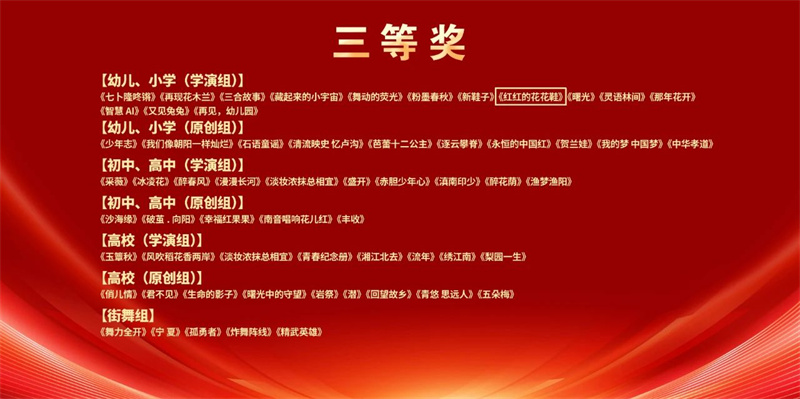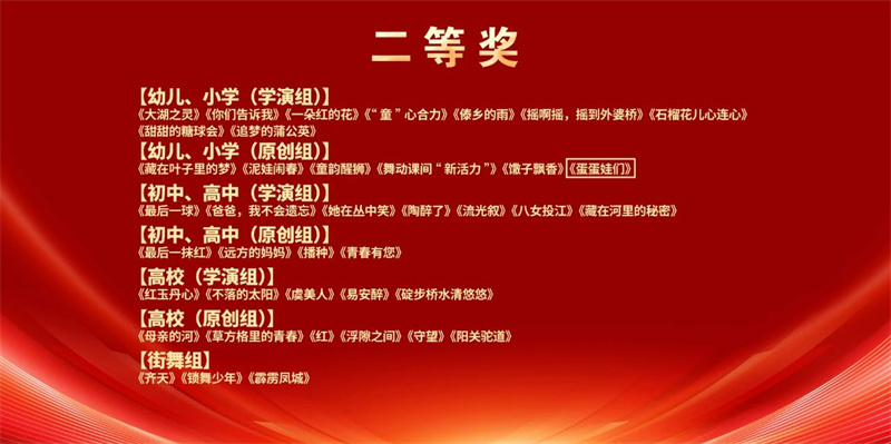 2025年4月28日,由宁夏回族自治区文学艺术界联合会、宁夏回族自治区教育厅、中共石嘴山市委宣传部主办,宁夏舞蹈家协会、石嘴山市文化体育旅游广电局、石嘴山市文学艺术界联合会承办的第十五届全区少儿“希望杯”舞蹈比赛暨全区学生舞蹈展演、宁夏首届优秀原创舞蹈作品展演在石嘴山市文化馆大剧院落下帷幕。由银川市舞蹈家协会选送的少儿舞蹈《黄河边的尕娃子》《蛋蛋娃们》《红红的花花鞋》分别荣获幼儿、小学原创组一等奖、原创组二等奖、学演组三等奖,其中少儿原创舞蹈《黄河边的尕娃子》受特邀参加了颁奖晚会并将代表宁夏参加第十三届全国“小荷风采”展演。