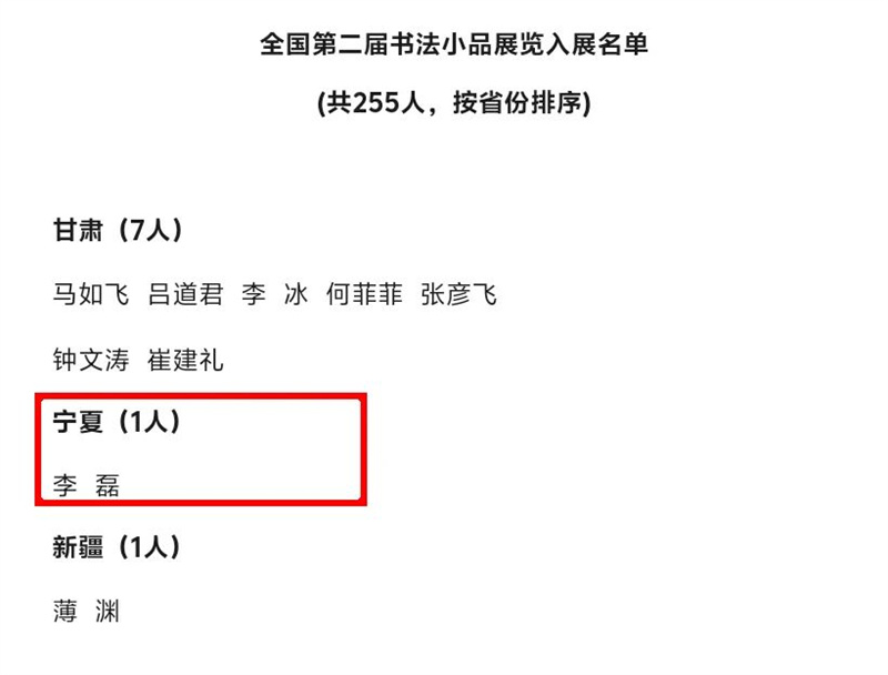 2025年4月28日,全国第二届书法小品展览评选结果出炉,银川市青年书法家李磊楷书作品入展本次展览,也是宁夏唯一入展本次展览的书法作品。