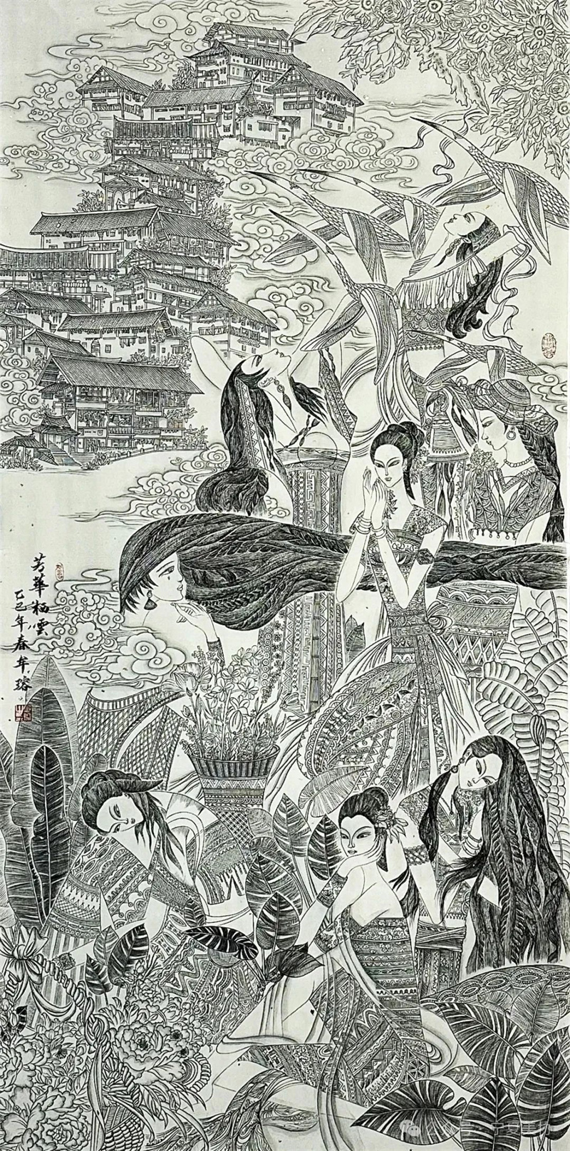 戴舒扬《鸢羽和鸣》中国画 138×69cm