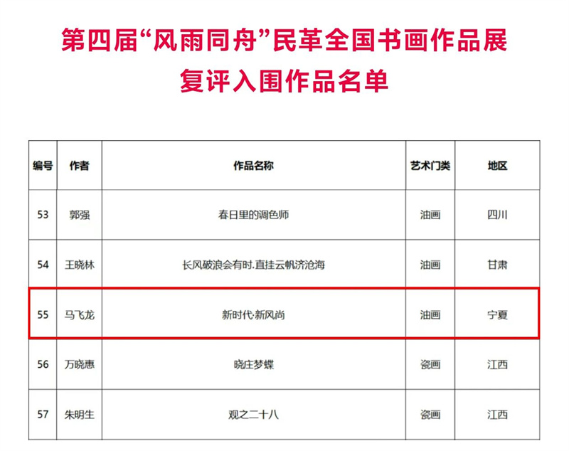 2025年8月17日,“共绘一江清水”第四届“风雨同舟”民革全国书画作品展评选结果揭晓,银川市美协会员马飞龙油画作品《新时代•新风尚》入选本次展览,也是宁夏唯一入选艺术家。