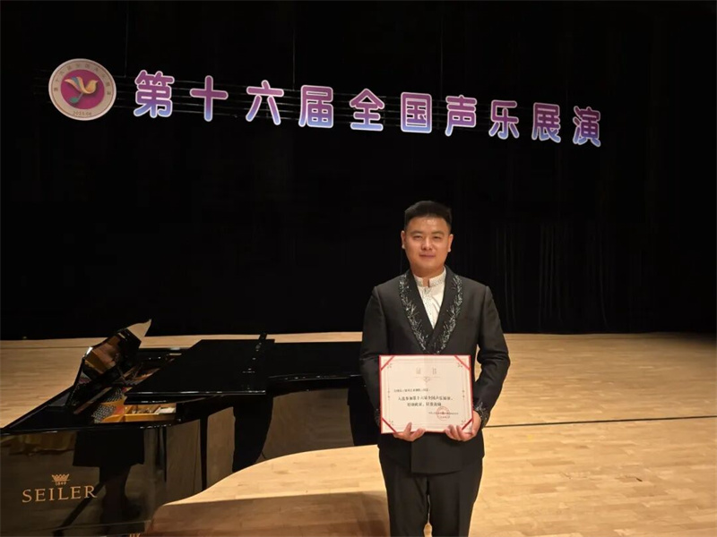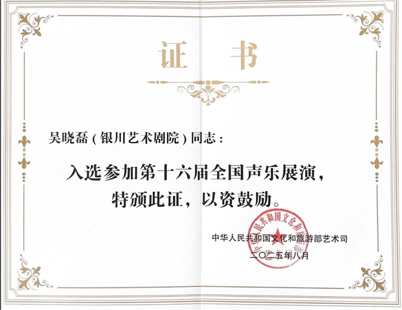 2025年8月29日,第十六届全国声乐展演成功收官。全国声乐展演是由文化和旅游部、哈尔滨市人民政府共同主办的高规格专业声乐活动,是发掘声乐新秀、展示艺术创作成果的重要平台。本届展演汇聚全国顶尖声乐艺术家,竞争激烈。银川艺术剧院优秀青年歌手吴晓磊经过严格评审,以优异表现赢得了展演资格。