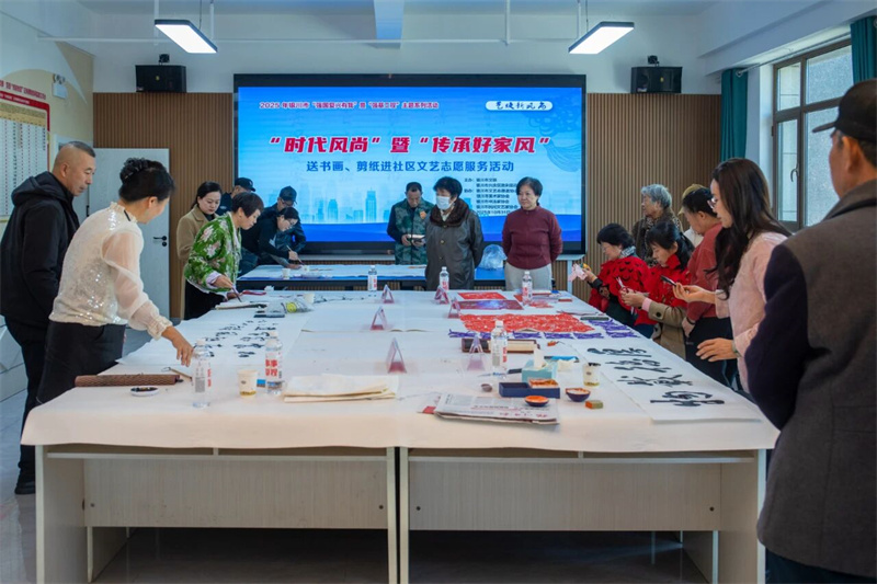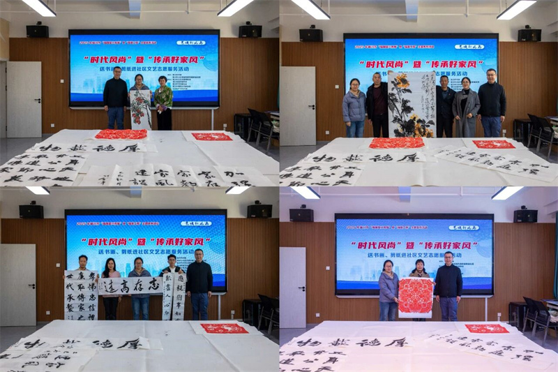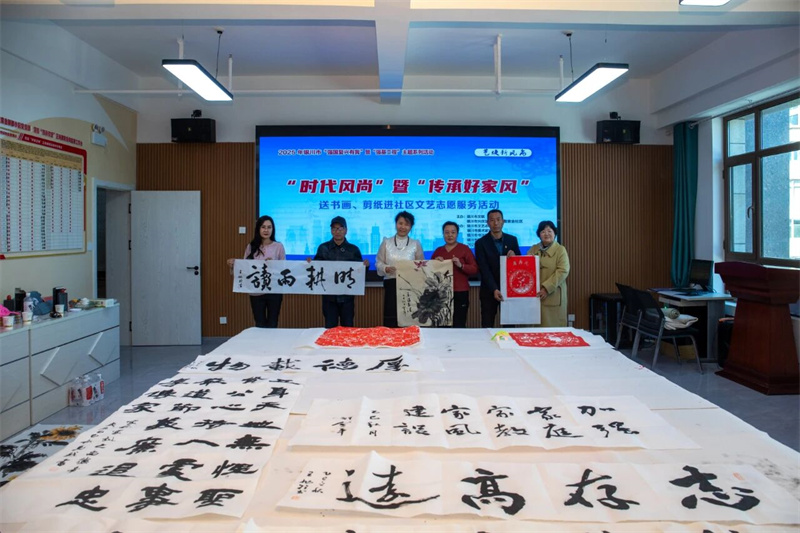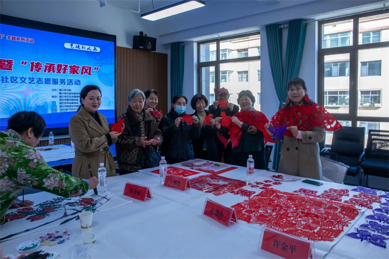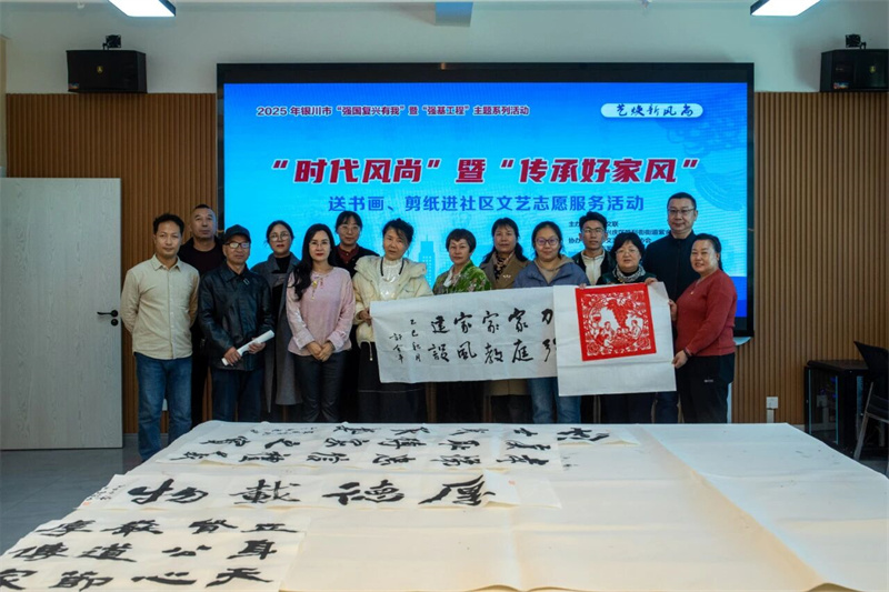 为深入学习宣传贯彻党的二十届四中全会精神,认真践行习近平文化思想,进一步推进“强基工程——文艺助力精神文明建设行动”,大力培育和践行社会主义核心价值观,在全社会大力弘扬以爱国爱家、自立自强、勤俭节约、清正廉洁、尊老爱幼等为内容的好家风,用文艺的独特方式,让好家风更加能浸润到群众心田,2025年10月31日,由银川市文联、银川市兴庆区胜利街街道紫金社区主办,银川市文艺志愿者协会、银川市书法家协会、银川市美术家协会、银川市民间文艺家协会协办的“时代风尚”暨“传承好家风”送书画、剪纸进社区文艺志愿服务活动在宁夏银川市兴庆区胜利街街道紫金社区温馨开展。