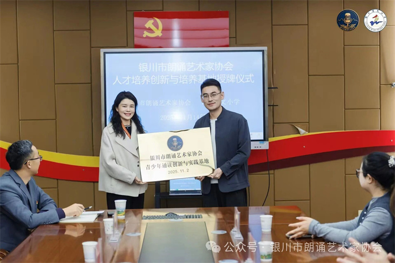 活动最后,牛旭代表银川市朗诵艺术家协会向刘春校长正式授予银川市朗诵艺术家协会首家“青少年诵读创新与实践基地”牌匾,现场响起热烈掌声。这块牌匾不仅象征着一段崭新合作的开始,更承载着双方对培育新时代青少年朗诵艺术良好素养的共同期许。